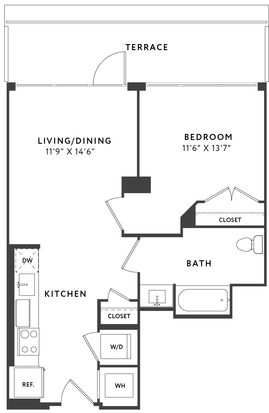 *Any outdoor spaces shown are only available in select units. All dimensions are approximate and subject to final verification. Sizes, finishes, and layout may be different across units in the same tier. Verify all dimensions and finishes with the leasing office.